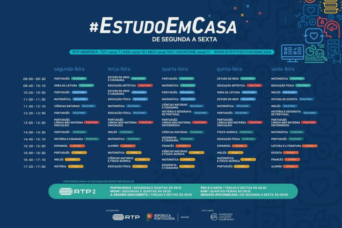 "No ensino básico, do primeiro ao nono ano, todo o terceiro período prosseguirá com o ensino à distância, que será reforçado com o apoio de emissão televisiva de conteúdos pedagógicos, que complementarão, mas não substituirão, o trabalho pedagógico que os professores vêm desenvolvendo com os seus alunos", acrescentou o primeiro-ministro. "A emissão desses conteúdos programáticos vai iniciar-se dia 20, na RTP Memória, que é acessível não só por cabo par também por TDT", avançou Costa. Haverá também um programa de apoio pedagógico, na RTP2, para as crianças do pré-escolar, com uma natureza distinta", acrescentou.
