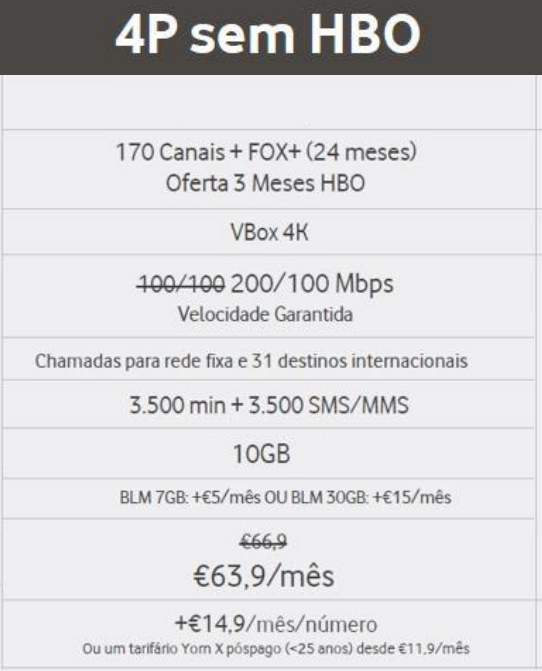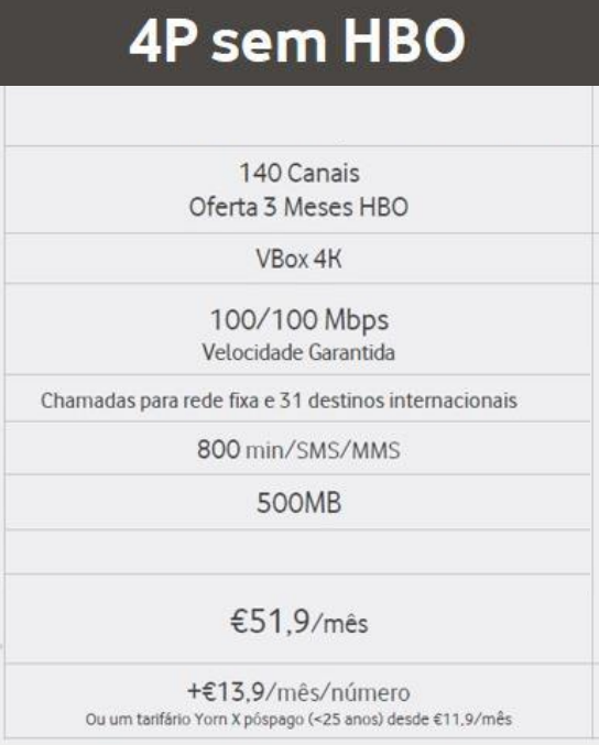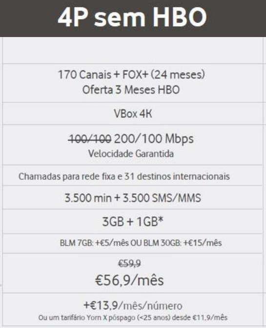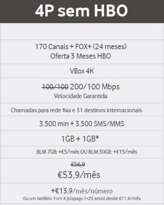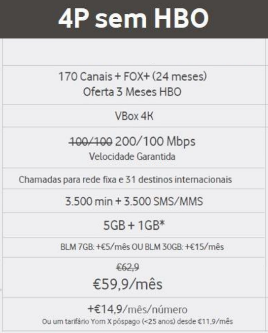 Condições válidas para novas adesões e com período de fidelização de 24 meses. IVA incluído à taxa de 23%. Upgrade de VBox 4K para VBox Pro 4K: +€2/mês. Valor referente à mensalidade do bundle (só contempla o 1.º número móvel). Caso não adira à fatura eletrónica, acresce €1. As ofertas de adesão de desconto em TV são válidas para novos clientes TV.